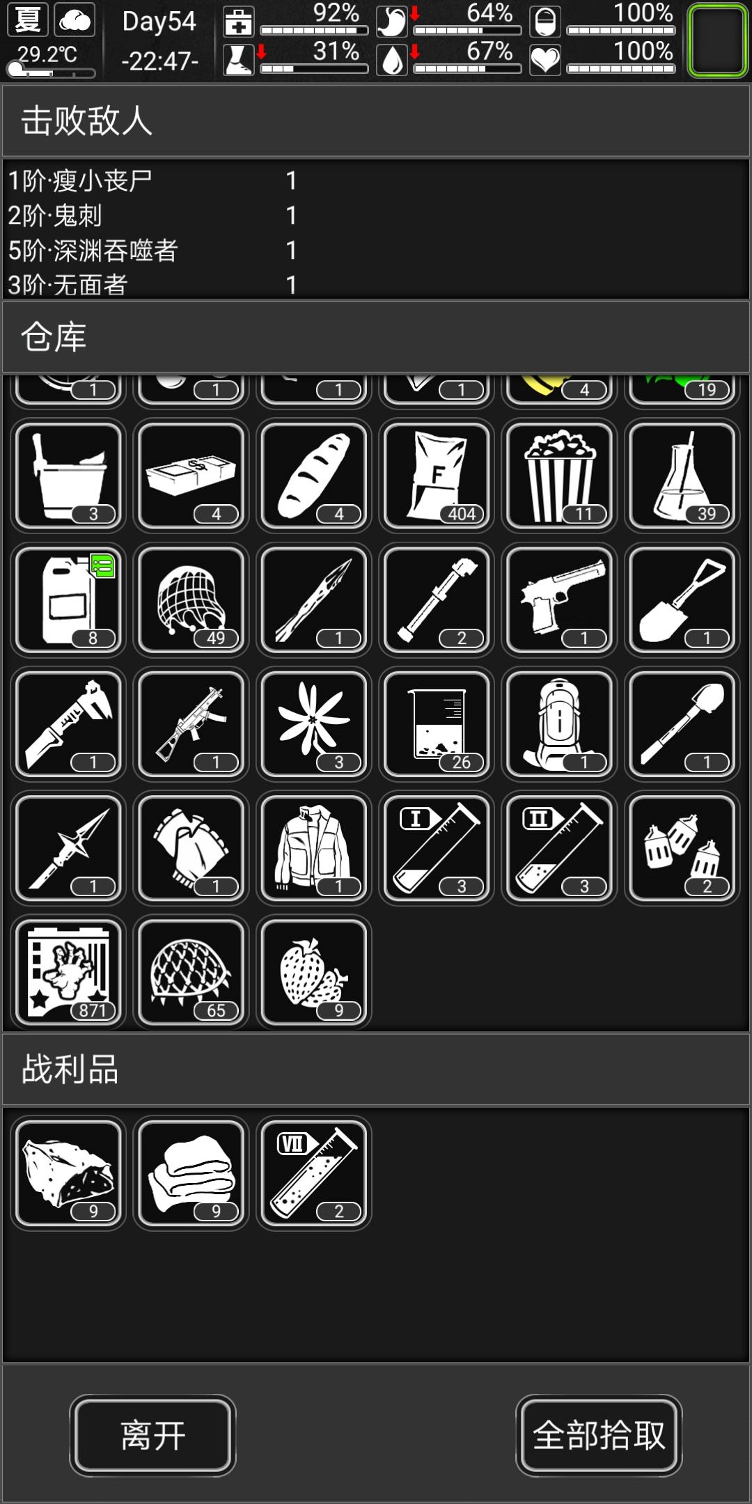 再一个就是像我这样的谨慎型菜狗远程武器不足,大部分应该依赖近战武器,攻击距离超1的怪一般就怂,所以推荐菜鸡同胞们打7阶诡首,一定保证体力满,不用带盾跑得快点(我没天赋),保险起见搞3把满耐久斧头,最好留一个能补体力的东西准备,基本上,我是从八九十体力打到32体力。当时只有1.4斧头,耐久,耗了一半多一点怪血,三把比较保险。游戏里应该是过了7个多小时,现实近1小时,全靠肝