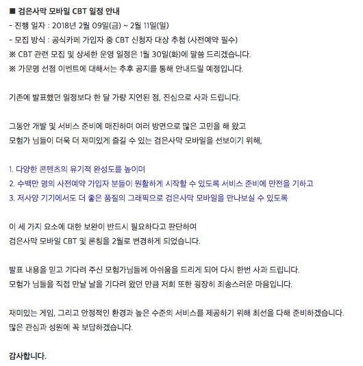 我们为了完善游戏内很多问题,努力达到这三个目标,《黑色沙漠M》CBT测试以及上线日期将延迟到2月份。再次对各位《黑色沙漠M》玩家说声抱歉,我们将为提供更多乐趣,更稳定的网络状态,更优秀的游戏体验继续努力下去。感谢大家支持!