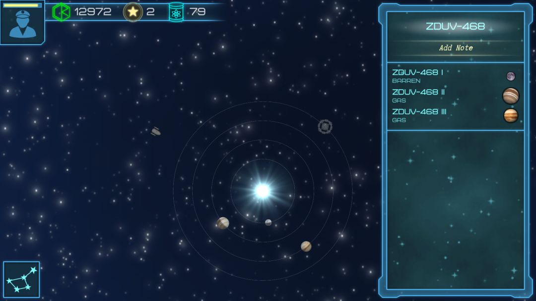 一开始你会在一个小星系里面,屏幕上方绿色标志是钱,金色星星是黑市货币,蓝色标志是油,你去每一个地方都会消耗油,不过很便宜2钱一个油