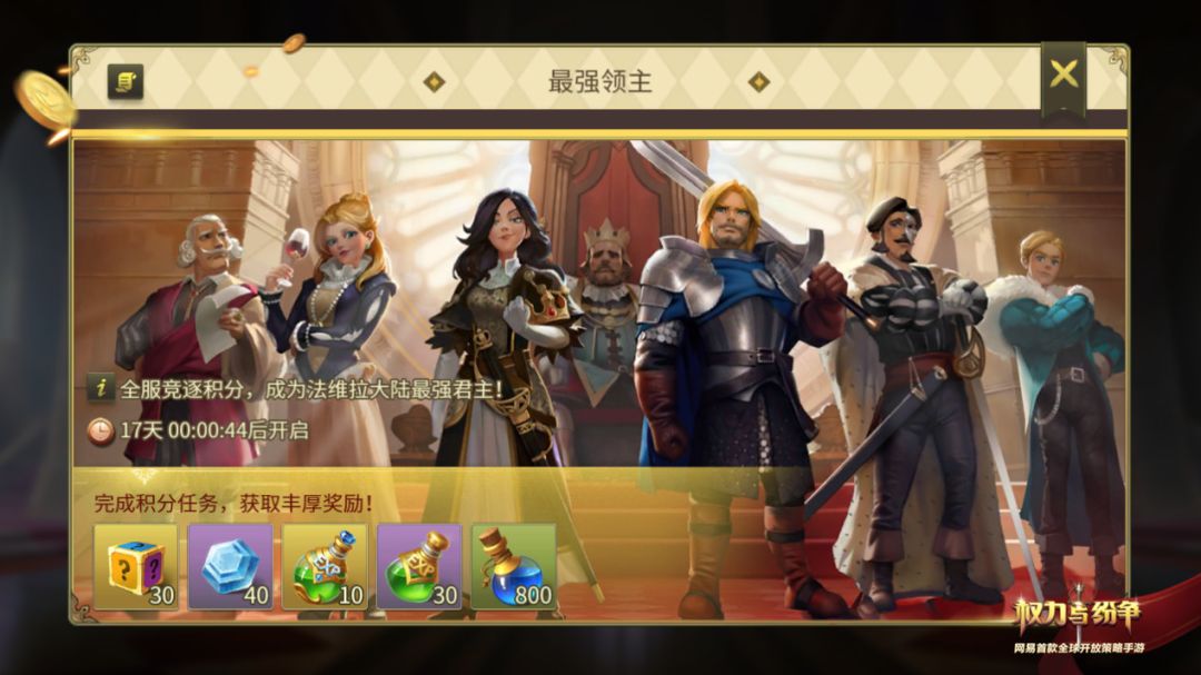 开启一场积分与时间的赛跑,加冕法维拉大陆最强领主,《权力与纷争》“最强领主”活动正式开启!在这场持续5天的比拼当中,领主们将依次接受“贸易大亨”、“荣耀之城”、“英勇杀敌”、“领袖战争”四大类挑战,找到不同的应对策略至关重要!