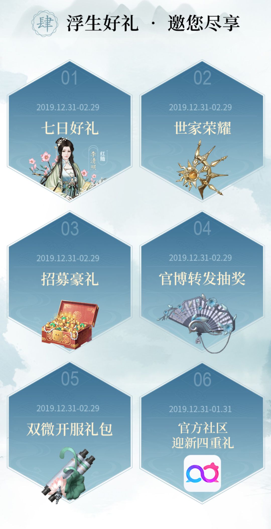肆-浮生好礼·邀您尽享除了集结奖励,《浮生为卿歌》还有更为丰富的礼包,包括游戏内的七日礼包、世家活动礼包、官方微博转发抽奖礼包、双微关注即送礼包以及“好玩友APP”内的丰富活动礼包~一切都在公测盛典中为您呈现~