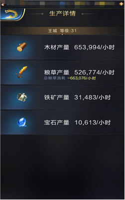 如何区分发展系武将水车委任对资源增产的作用,可以通过生产详情来说明(图7所示)当前委任荀彧和杨修状态下,城内4种资源田每小时产量;(图8所示)取消水车武将委任后,城内4中资源田每小时产量。