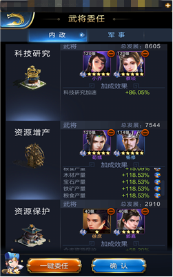 以木材产量为例,每小时产量就相差197134,一天产量在有白泽“朗月清风”技能和君主技能“丰收”作用下,产量相差197134X52=10250968,委任与否,仅相差部分就高达千万资源。