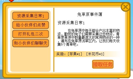 1.游戏新加3个日常采集任务,分别是采集资源1-4,打开礼包,给小伙伴们点赞,和小伙伴们聊聊天。