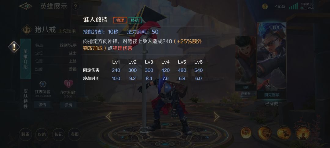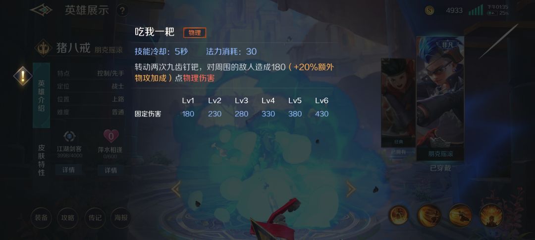 猪八戒作为一个战士,首先要的就是抗压,以及强势的开团,并且为脆皮提供最好的保护(向我开炮),所以我们前期尽量猥琐发育,等到四级以后才是我们发挥作用的时候。