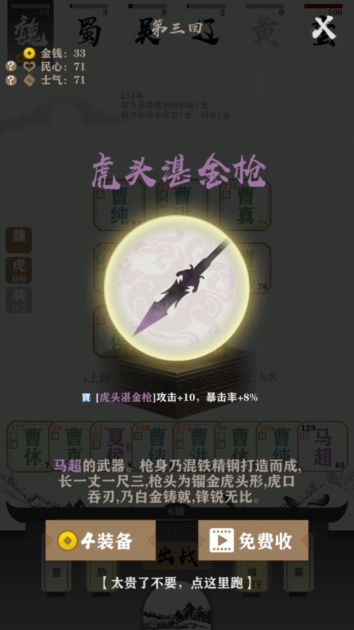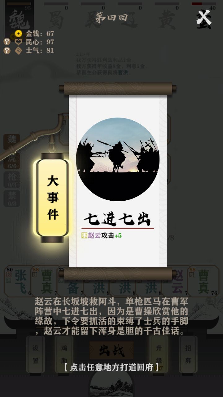 鸡肋用处:增加/减少民心,增加/减少士气,增加/减少金钱,当你钱够多且你购买武将有武器时,会出现武器(也可看广告白嫖)当你拥有武将有大事件(也就是缘集中的机缘时,会有概率触发)。