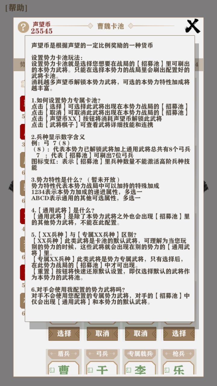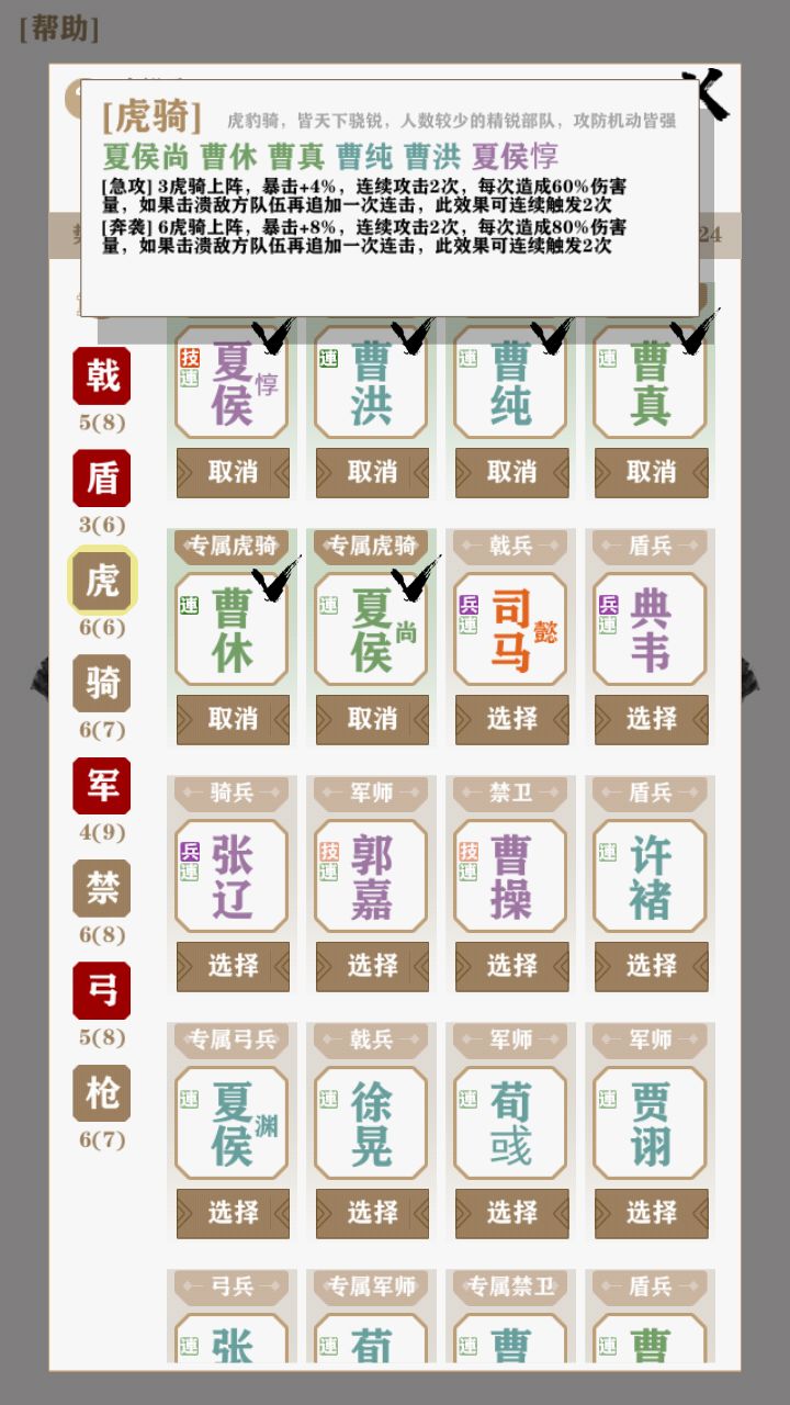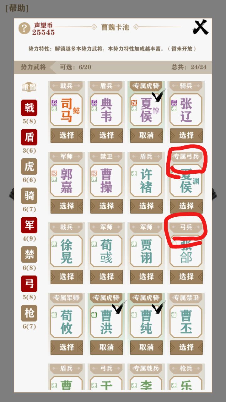 池放了60张卡,而你想用其中的几张,肯定比只有50张卡的卡池概率要低,点将的作用就是精简卡池,让你想玩的武将概率变高(相对变高),比如上图,我想玩虎豹骑,我就只√虎豹骑,出虎豹骑概率就增加了(因为有公共卡池,所以不可能100%出某张卡)