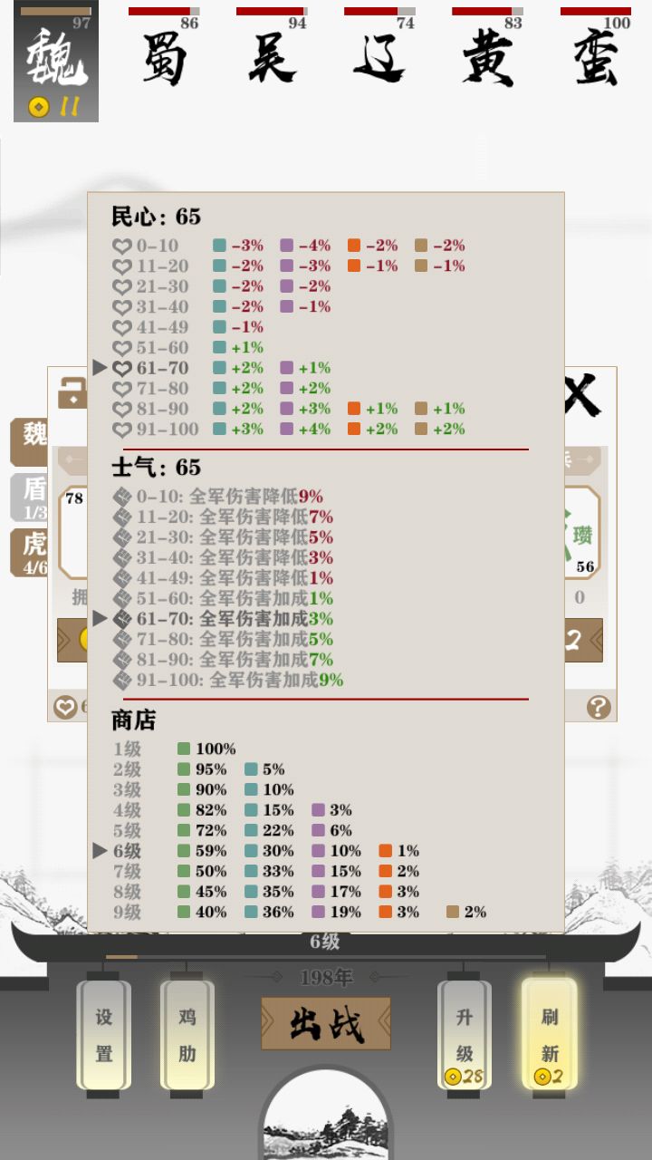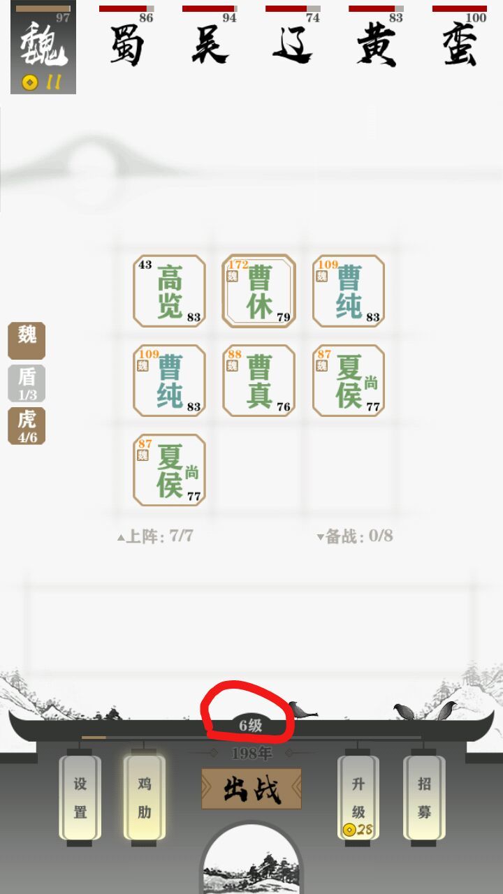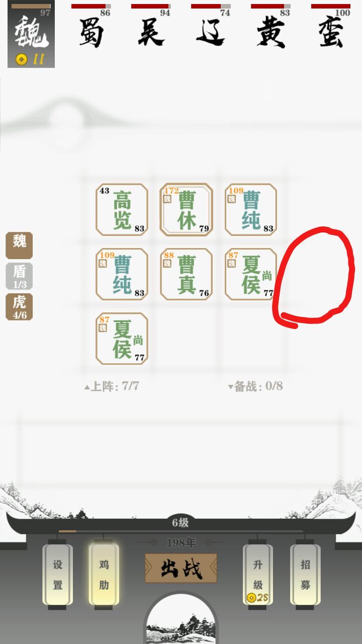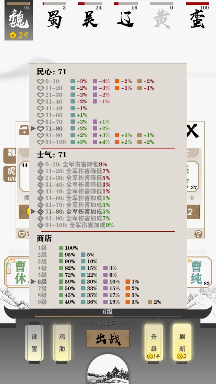 2:将等级升到9级,商店将有概率刷新出美人,花6金购买(提升民心也可以让商店有概率刷新出美人,图中圈住的地方就是美人概率)