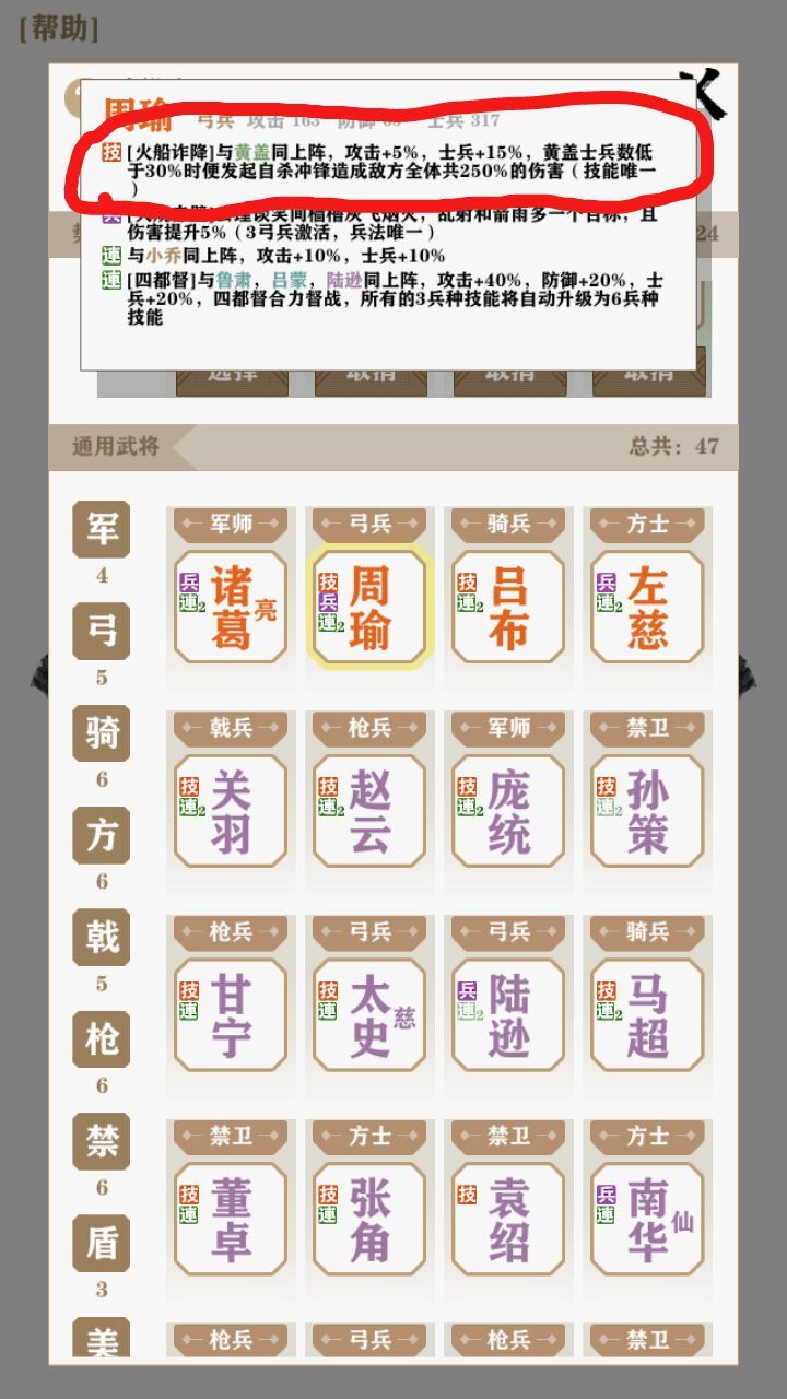 武将信息(攻击,防御,兵力/血量,兵种,连携,技能,兵法等):点击武将或者退出对战点击缘集里的义缘都能查看武将信息(义缘需要购买一次武将才能激活)其中圈住的地方是武将的兵种