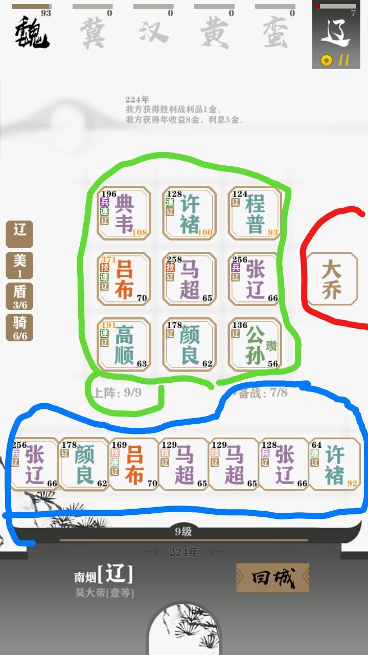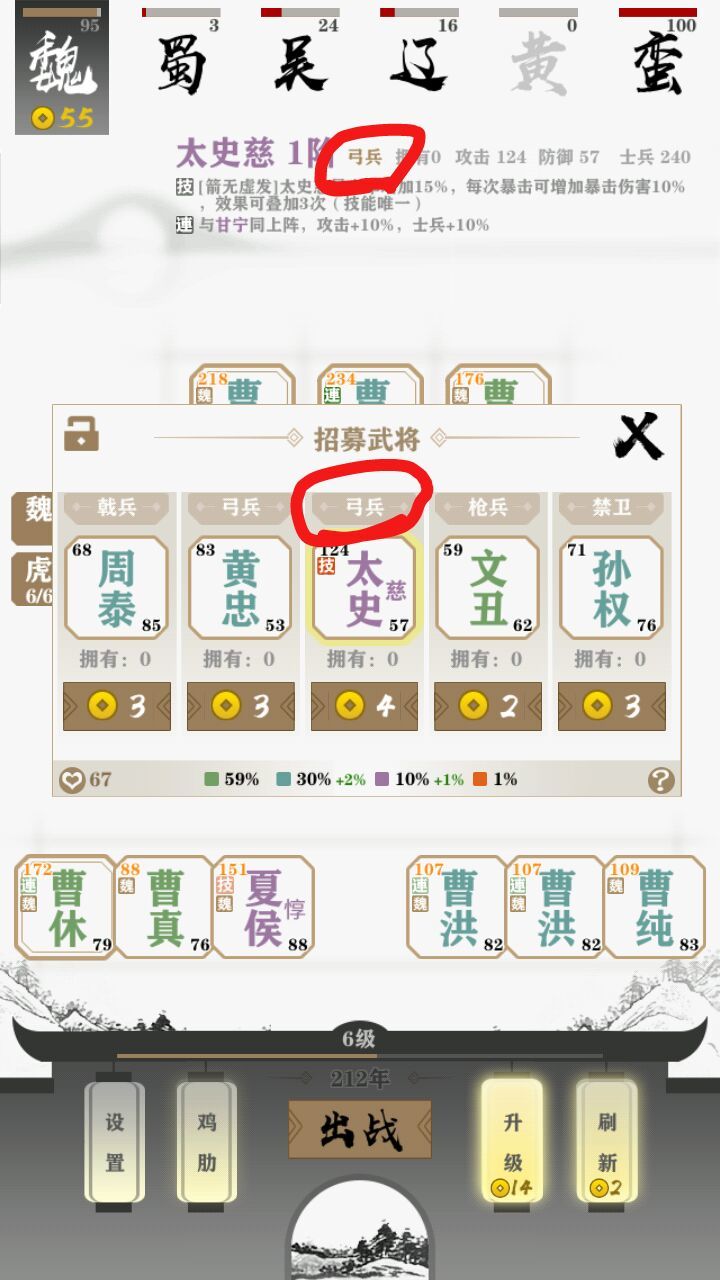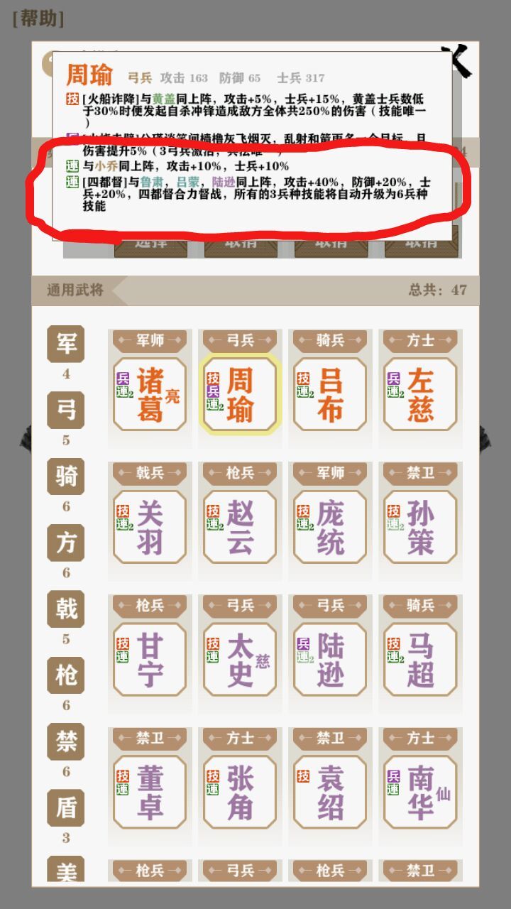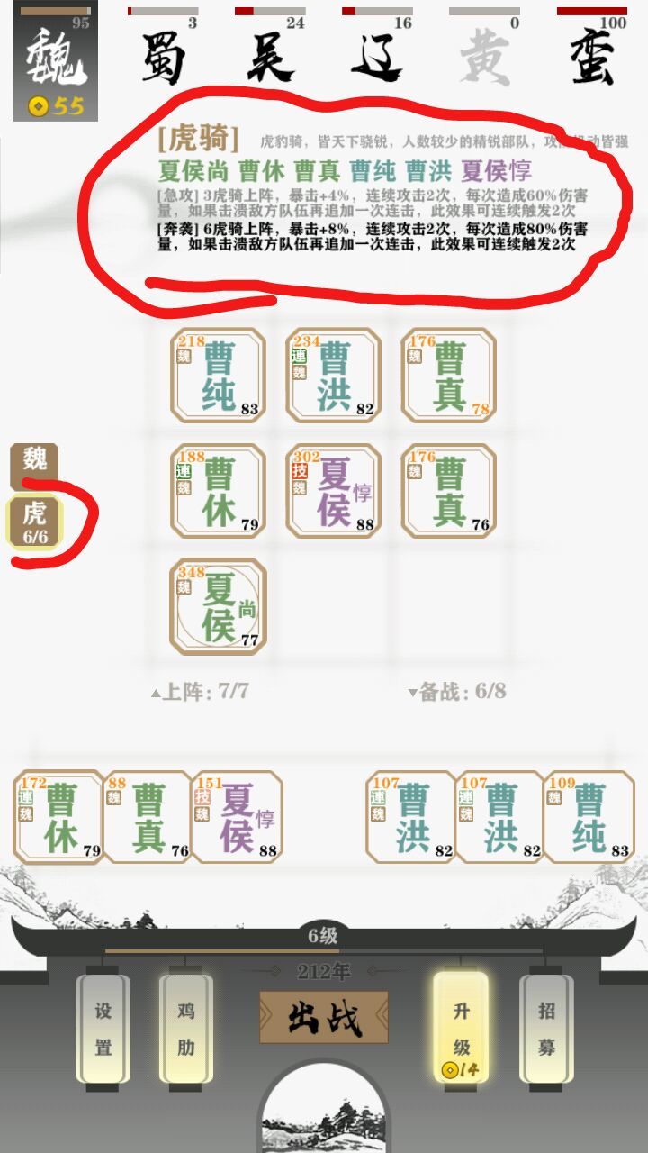 兵种:每个武将都有不同的兵种,且每个势力都会有专属兵种(目前只有魏的虎豹骑和吴的水师),其中三个/六个不同名相同兵种武将可以触发兵种技能,每个兵种技能都不相同,定位也不相同。对战中想查看是否触发兵种技能可以点圈住的部分,其中三个触发低级兵种技能,六个触发高级兵种技能