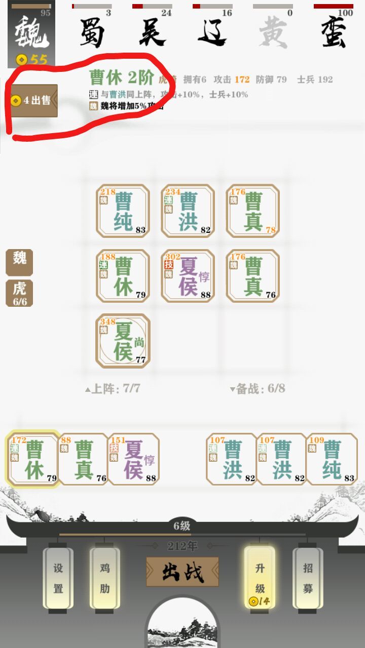 武将卖出:目前一阶武将卖出是不会亏损金币的,即你买时花多少金,卖出卖多少金,当卖出二阶武将时将亏损一个一阶武将的金币(所以卖一个二阶武将只能卖出两个一阶武将的钱),当卖出三阶武将时将亏损一个二阶武将的金币(同时一个二阶武将亏损一个一阶武将,所以卖一个三阶武将将只能卖出四个一阶武将的钱。三阶武将卖出计算有点麻烦,可以死记住卖四个一阶武将价钱就行了)比如下图,一个绿色武将一阶买花2金,卖花2金,但绿色二阶武将卖只能卖4金(2*2),三阶武将只能卖8金(2*4)