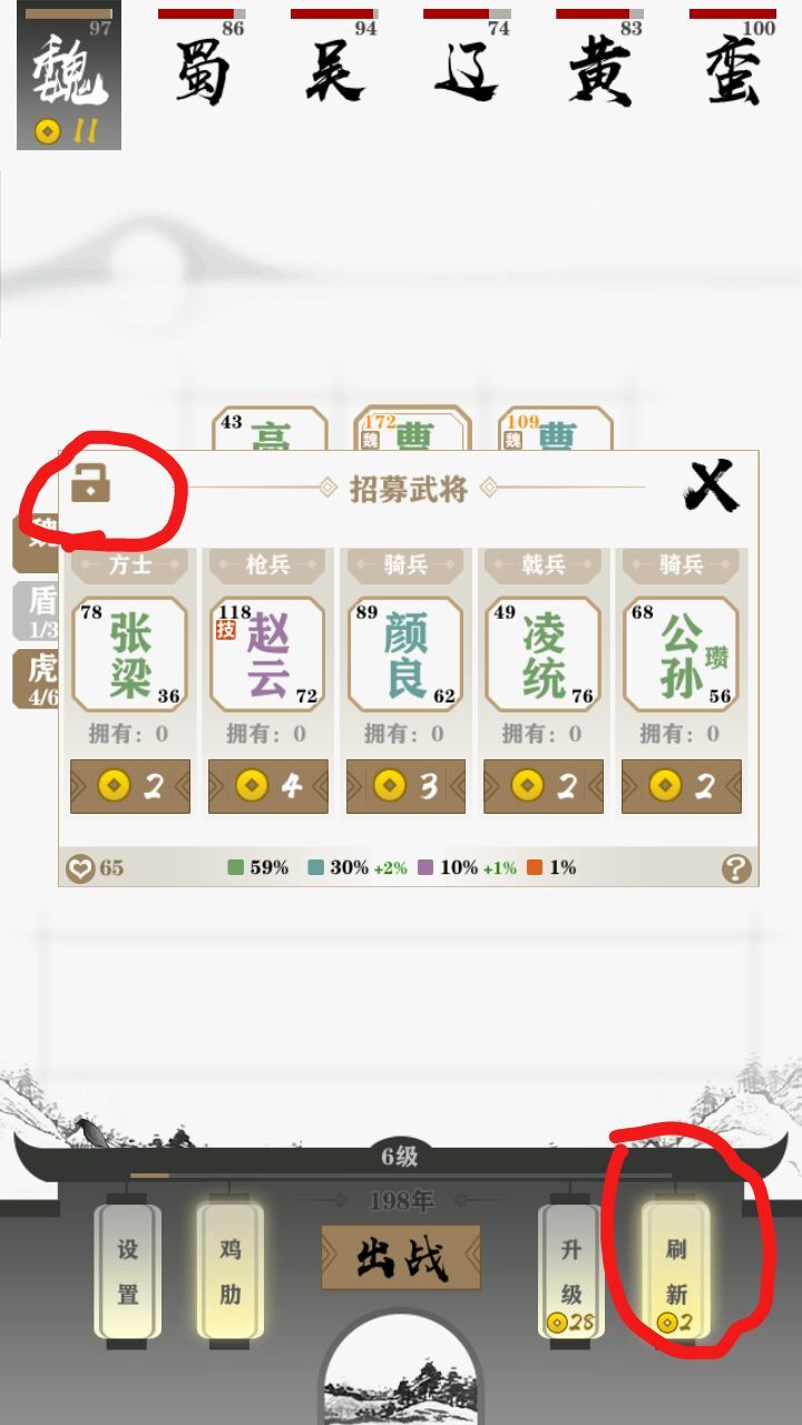 商店:商店就是用来购买武将的地方,每次商店会上架五个武将,如果你不满意可以点下图中圈住右下角刷新花费2金来刷新商店,(每次对战结束商店都会自动刷新一次)如果你金钱不够,但碰到了想要的武将,可以点下图中圈住的锁,他会让下次商店不自动刷新,等你明年有钱时就可以购买(绿将2金,蓝将3金,紫将4金,橙将5金,美人6金)