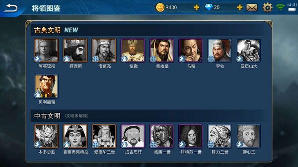 将领根据兵种分别为步兵、弓兵、骑兵将领,点击图鉴可查看不同时代的将领。