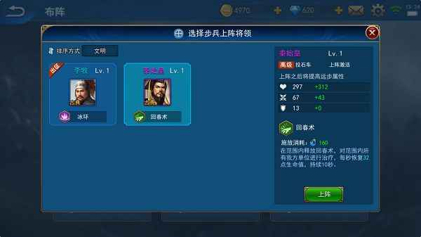 我们可以看到秦始皇上阵后已出现在布阵界面,且上阵前的龙射手变成了更强的弓兵兵种投石车。步兵、骑兵将领上阵方式也是一样的哦~