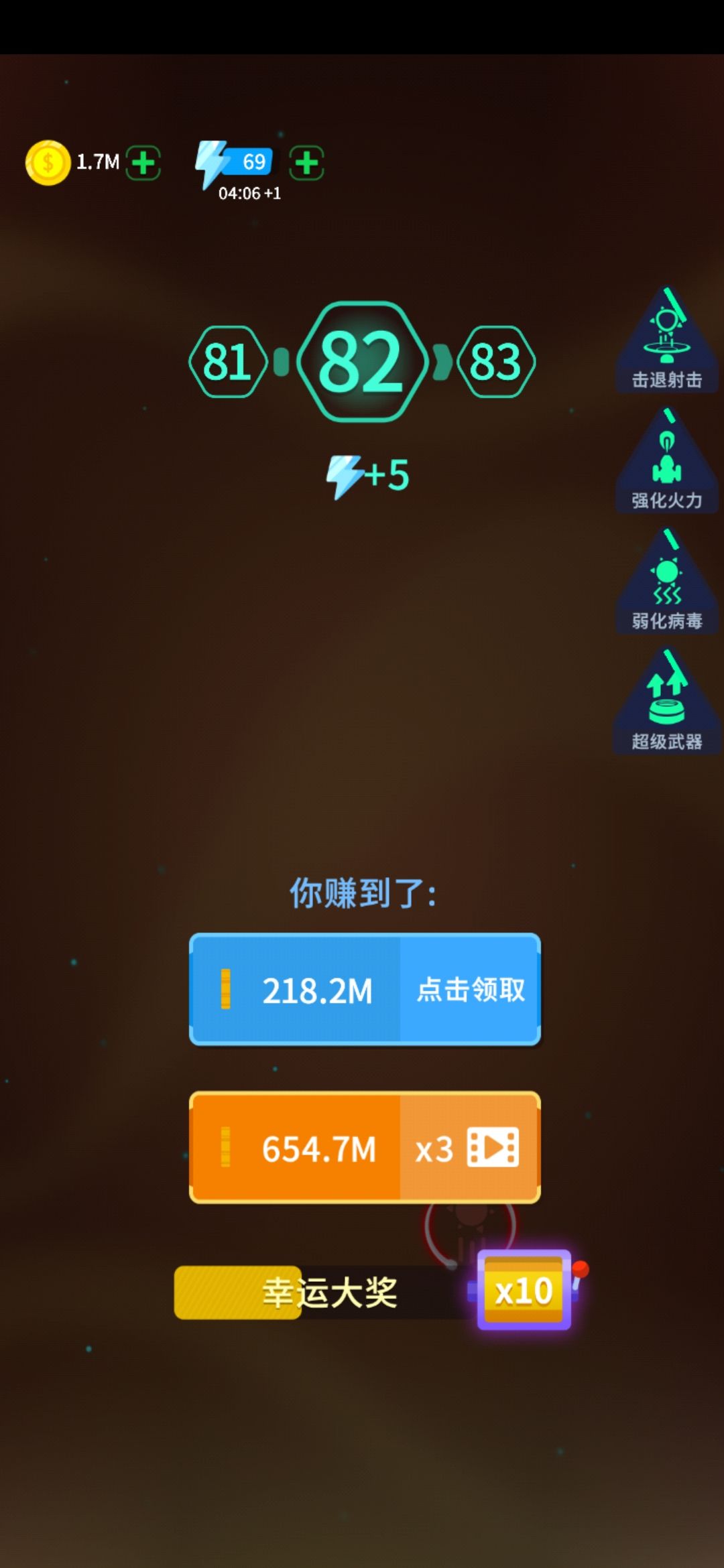 注:系统提示加火力射速等级的时候,强退重新进就好了。我也是看了好多大佬说的,自己总结了一下,打的蛮爽,钱也不少。副武器选择就是,小火炮,那个飞盘,黑洞,后面几个我没试,看你自己吧。到那个时候,钱应该蛮多。还有一件事,满级小火炮搭配巨化病毒buff很是舒适!![[嗒啦啦2_期待]](https://img.tapimg.com/market/images/4586b6e33f74e054079a0d9aaed70aee.gif)