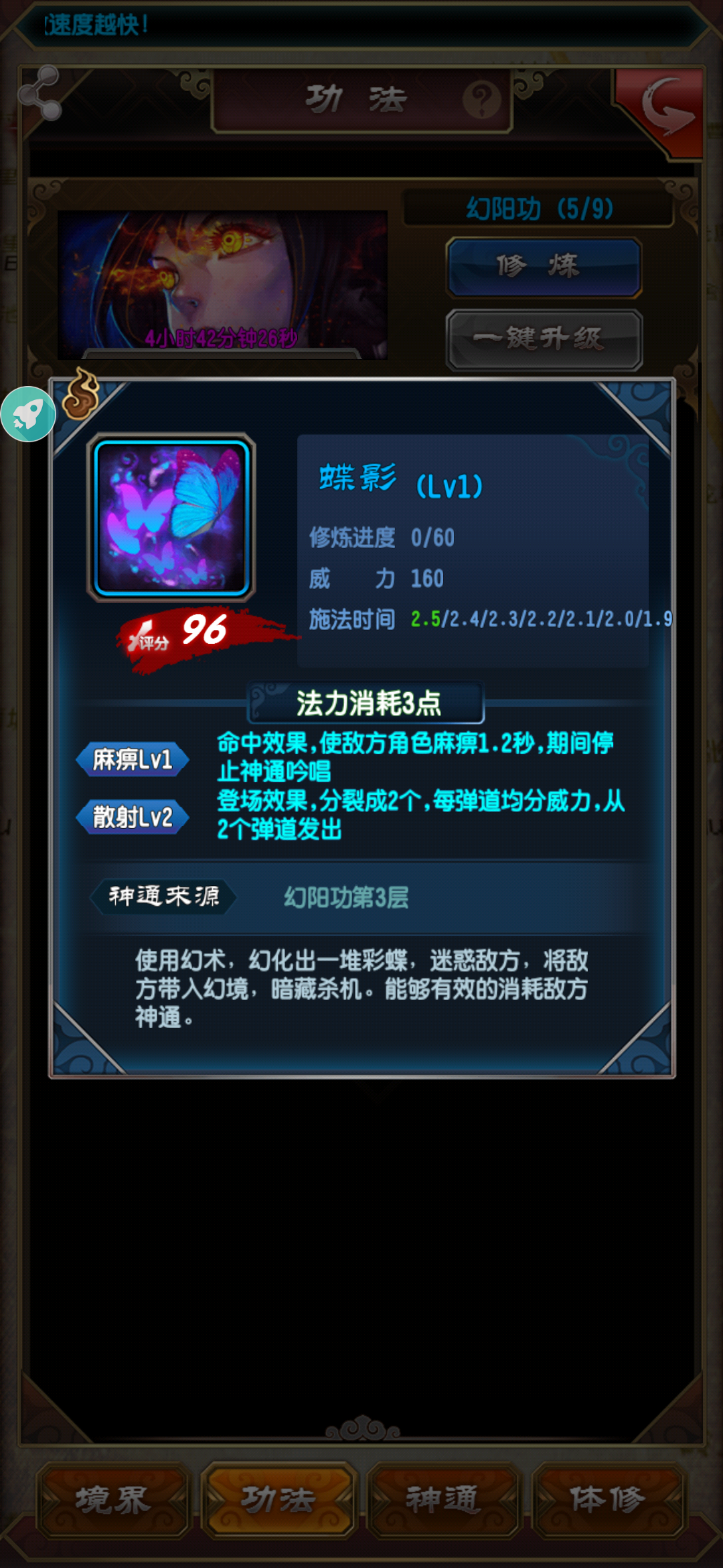前期我们可以先用幻阳功延长眩晕的时间,后期可以配合海妖魔功(满级拥有60%的眩晕和震荡)