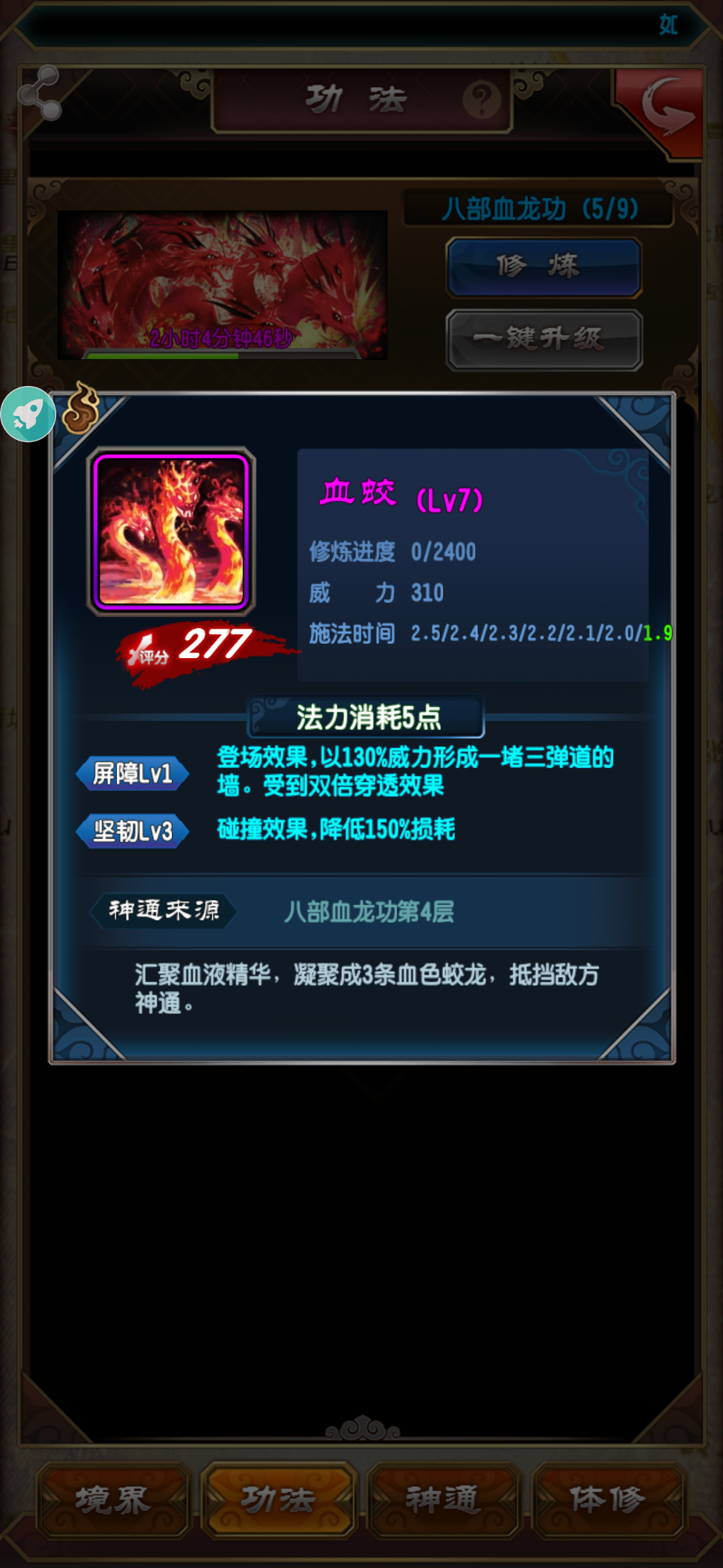 八部血龙功:损失1%的血量,伤害提高0.6%