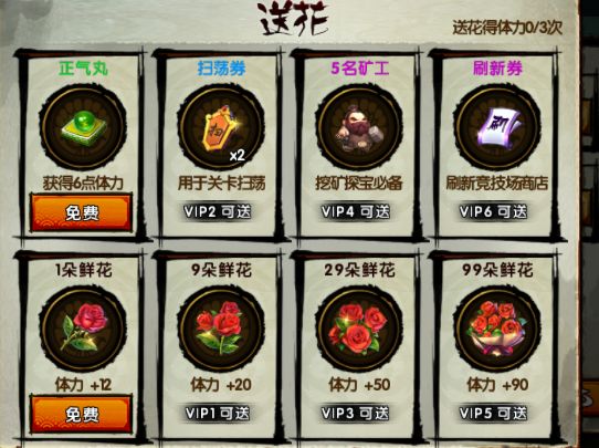 送花得体力,每日前三次送人得体力,如果送付费的花,得体力更多