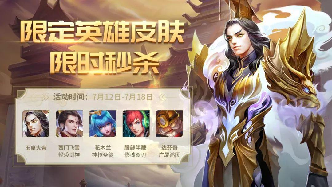 7月12日—7月18日,限定英雄皮肤限时秒杀开启,积分英雄玉皇大帝、各种珍稀皮肤等你来拿。