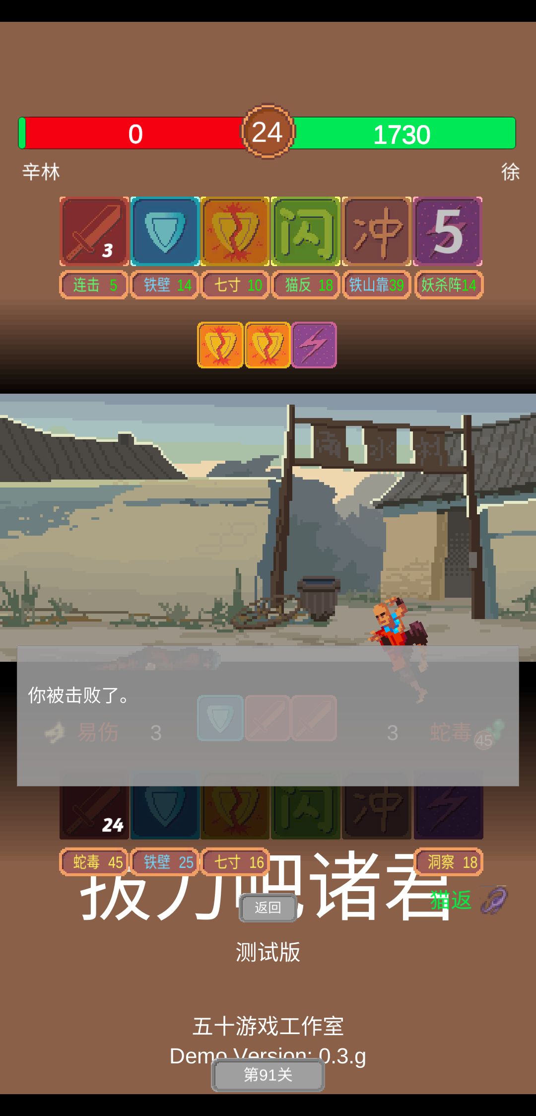 对手出,冲,闪,防御。都不管。后面拼刀也没事(前五十关技能伤害不高基本十几点),承受不了了,马上洞察看牌打。