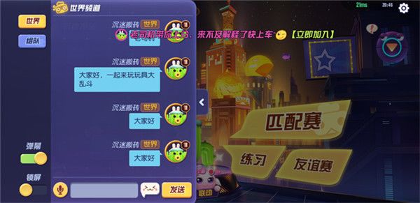 想要即时看到其他玩家在游戏中的种种吐槽吗?现在,《玩具大乱斗》在世界和组队聊天频道新增了弹幕开关。玩家只要开启开关,就可将该频道内容以弹幕形式显示在界面上哦~