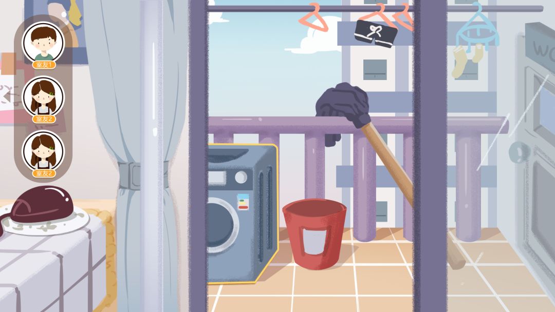在每次进行卫生之前,你需要进行卫生状况的检查,来决定哪些区域需要清洁,寝室卫生分为公共卫生区域和个人卫生区域,个人卫生区域一般由个人打扫,而公共区域则会由寝室长进行分配,当然你可以帮助别人进行分外工作来赚取他人的好感以及贡献