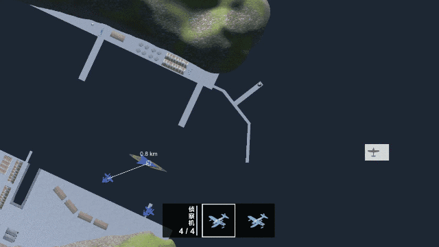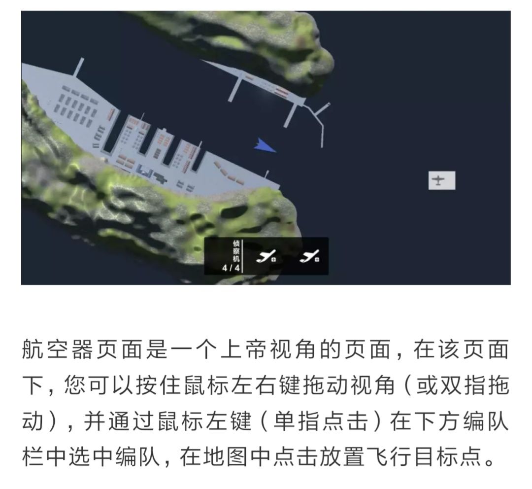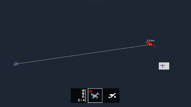 当点击下方编队栏中已经起飞的舰载机时,编队将会通过白框提示已经选中,这时屏幕上也将提示当前编队的目标点及距离目标点的距离。此时点击海面即可为舰载机下达新的目标点,再次点击编队栏中已选中的编队,会将镜头移动到当前编队上。需要注意的是,舰载机也有着转弯半径及时间,并不能对您的指令产生立即的反应。
