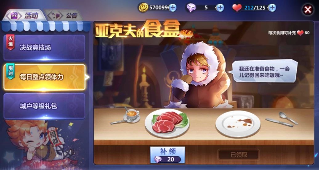 每日中午和晚上都可以领取系统赠送的体力,如果错过还可以支付少量钻石找回。