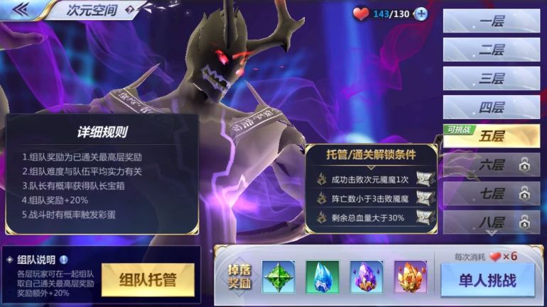 参与挑战次元空间材料副本,每次消耗6点体力,掉落斗士觉醒第七感材料。