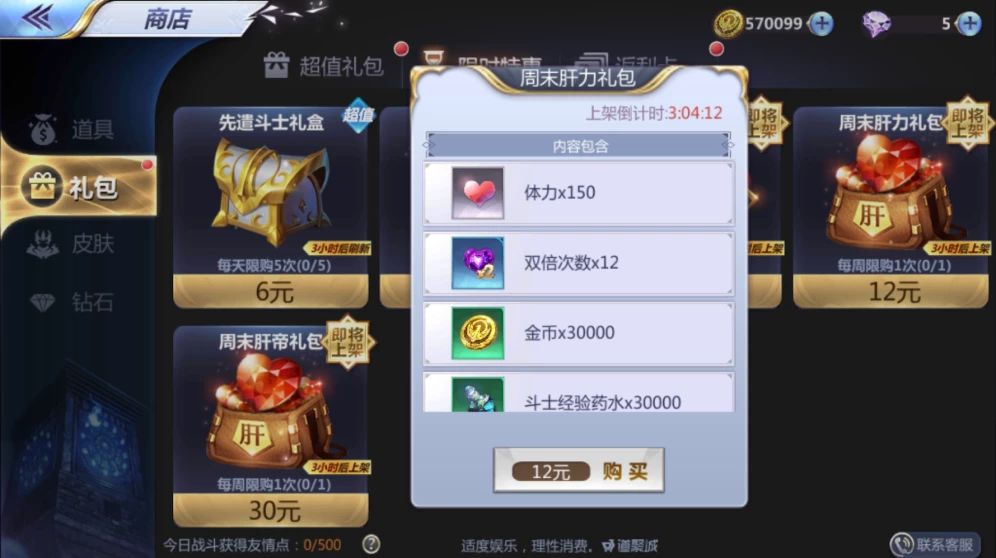 礼包商城会有内附体力的礼包限时上架。