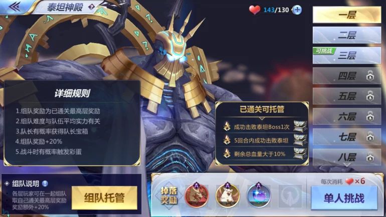 参与挑战泰坦神殿材料副本,每次消耗6点体力,掉落小宇宙