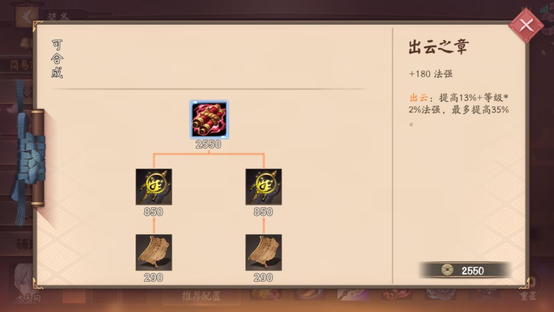 180点法强,法器中加成最高的法强,配合他的被动效果,使得法强上升到一个巅峰的数值。由于“出云”被动受到等级的影响,所以最好等到后期的时候出,才能使他的作用最大化。