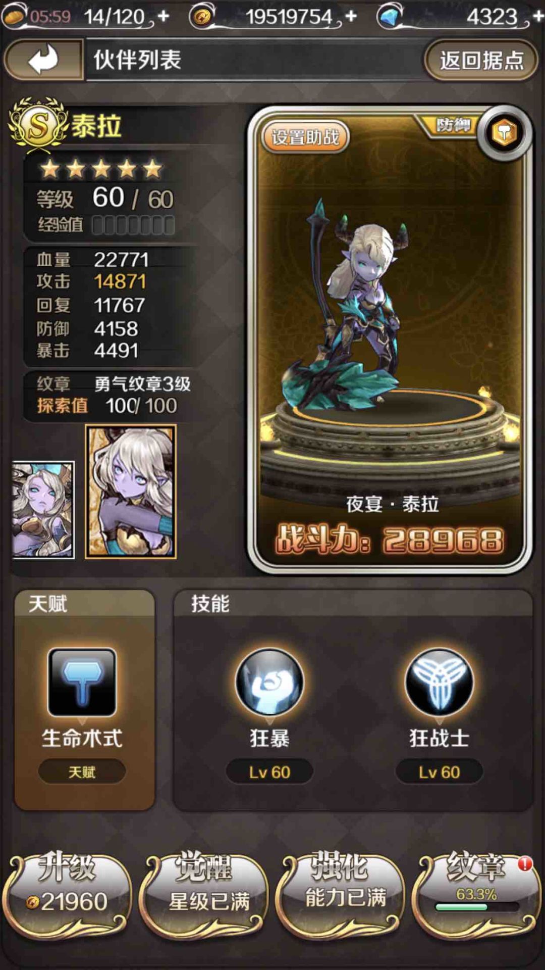 一看泰拉的天赋,又是个吸血的,三大吸血人物之一嘛,特别需要注意的是她的s级天赋狂暴形态后吸血效果提高80%,这个可是相当厉害的。先结合她的主动技能我们来说下,主动技能狂暴需要25点能量,提高自身攻击力,全体队员受到的伤害降低50%,持续3回合,是不是有点全体开启小盾墙的感觉有木有,泰拉也是目前全人物里唯一一个主动技能减伤的角色了,而且减伤幅度达到了50%,已经是很高了。在开启狂暴形态后,其吸血量也是大大的提升,普通形态下的吸血真是少得可怜,多一点也就吸个几千了不起了,而一旦开启狂暴形态,这吸血量都是2W+,自身也提高了不少点攻击力,输出也可以大幅度提高,同时也为队伍的续航生存提供了保障,加上全体减伤50%的强力buff,想翻车都不是那么容易滴。被动技能狂战士,提高血量,并且在受到群里攻击或针对泰拉的单体攻击后,泰拉攻击力提高10%,持续两回合,最高可叠加5层,并有几率生成一颗爆珠。这里我唯一想吐槽一下的就是持续两回合真是有点短,如果能加到3回合的话那泰拉的输出又将更上一层楼。所以综上所述泰拉真的是一位集合减伤吸血输出的万金油人物,其使用价值在如今的红本地位也是很高的。我个人打副本是比较求稳的,所以我很喜欢上泰拉,哪怕有一个队友掉线,只要有泰拉在不会翻车的几率还是很大的,而且人家并不只是纯防御类人物哟,加攻击的buff一旦触发,主动技能一开,这输出也是扛扛的。技能介绍完了,我们再来看一下泰拉的纹章