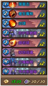 【炎球、熔岩球】:两种横排飞行法术。优点是和落雷击一样可解怪可补伤比较灵活,且造成的伤害数值具有很高性价比。缺点就在于它们的横排飞行特性,如果预判不准很容易打到敌方的低威胁随从亏到爆,建议配合咒术系督导或米拉使用以规避损失,或者先在横排施放范围攻击,再使用确保打到脸。这两种法术更加适合打脸造成巨额伤害,起手一般不留,最多1张。