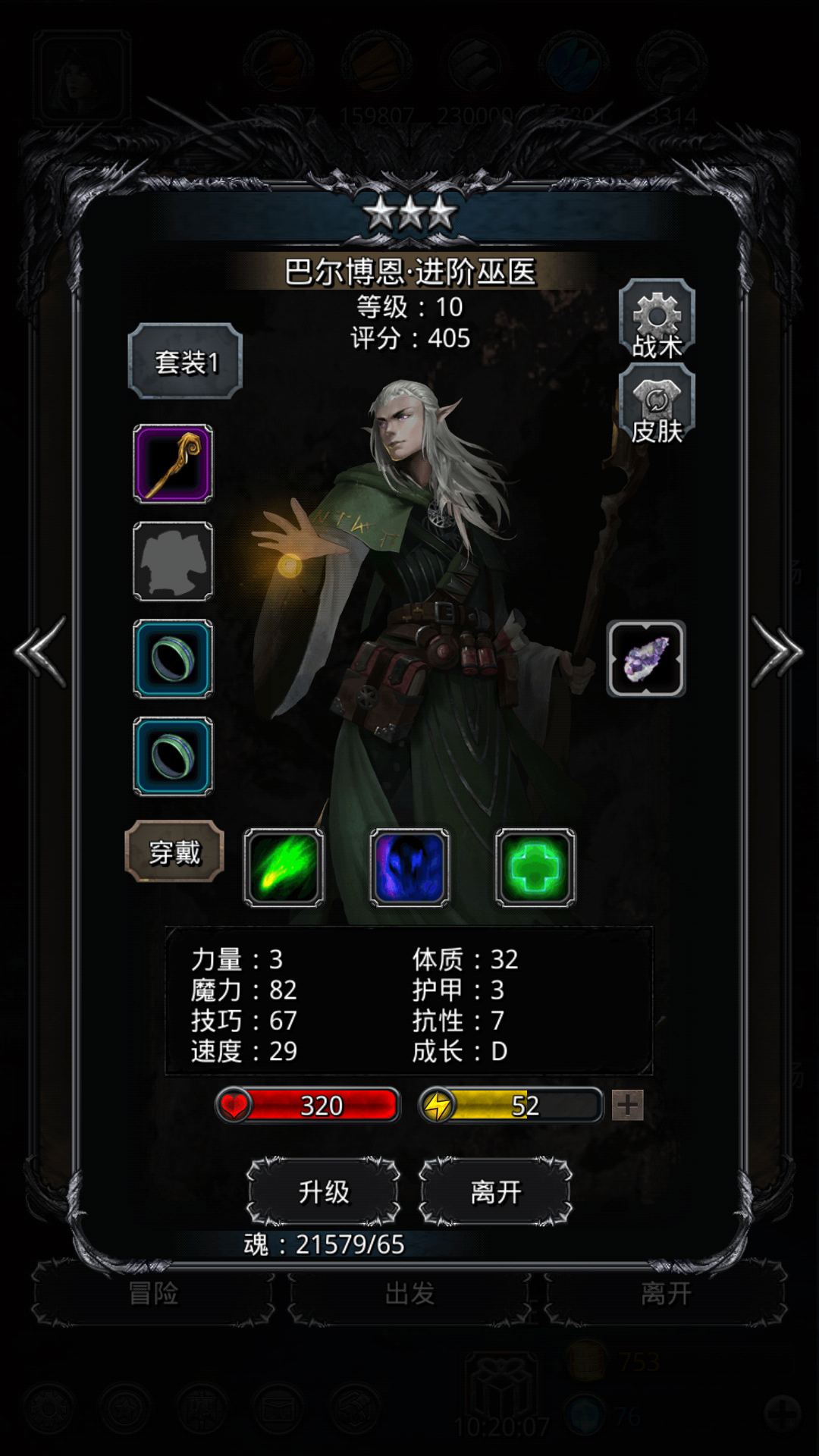 巫医必须用白色,不然升几级血就多了,我只有个垃圾紫色武器,没穿衣服,不然抗性太高了(不能高于12,别的攻略说的),做了两个加技巧的命中戒指,提高输出效率。血量保持300多一点点就行了,力速比最多0.2左右,不然没机会出手。