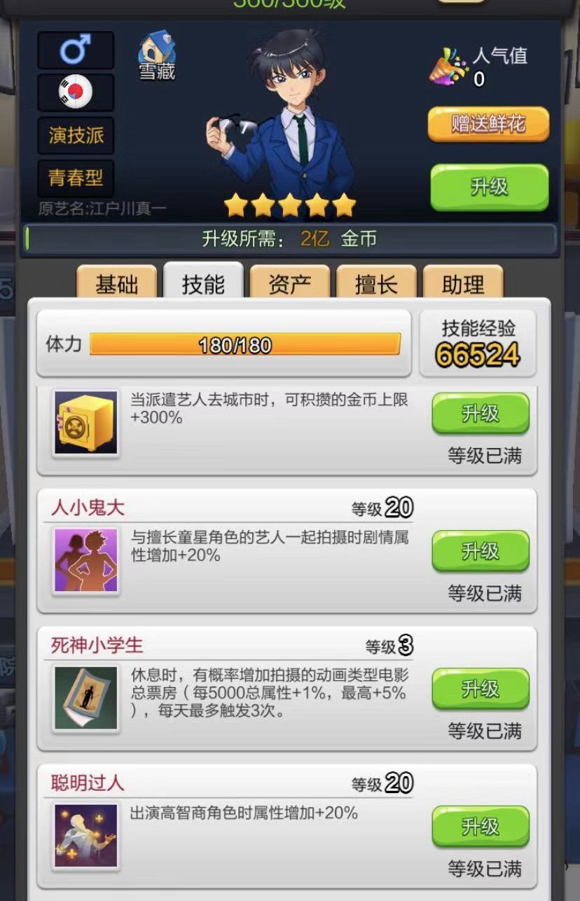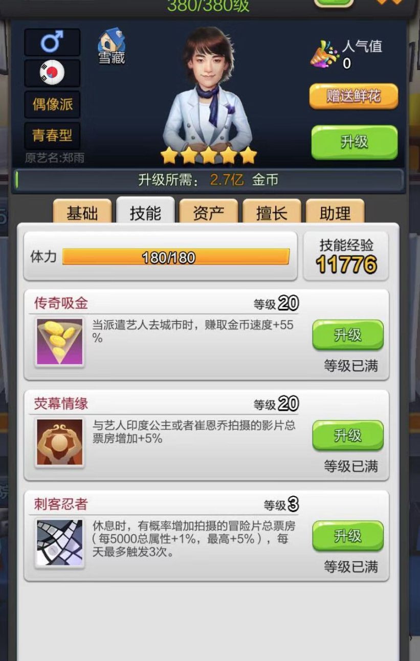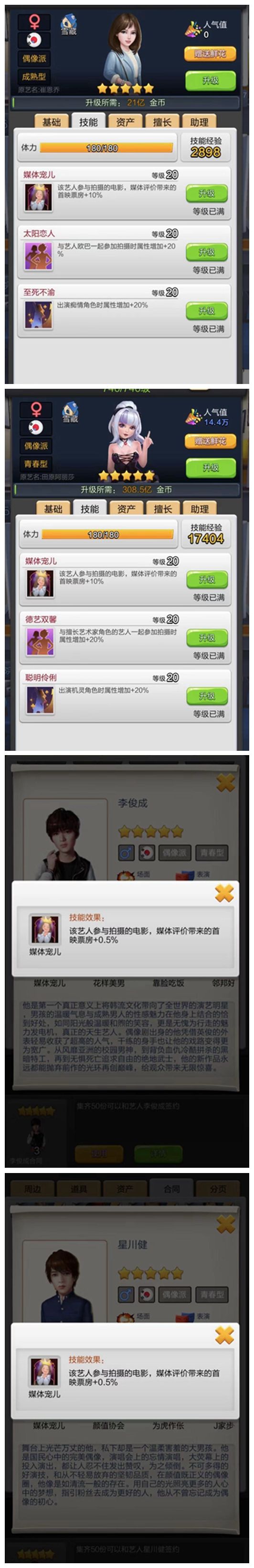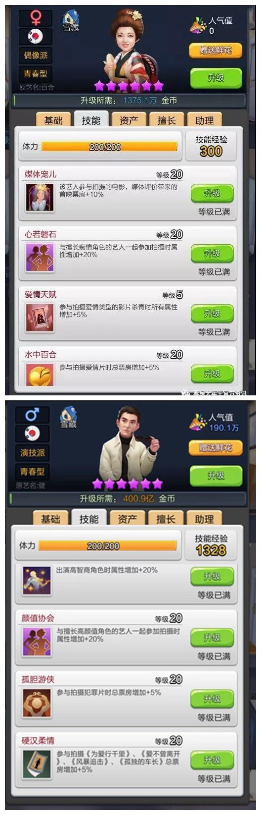 刚刚出道就瞬间引爆玩家口碑的日韩殿堂级艺人双子星,正所谓男女搭配,干活不累。一个擅长爱情片的百合配上一个擅长犯罪片的健,让整个游戏似乎都充满了乐趣。自身宠儿技能搭配特定类型(百合—爱情,健—犯罪)5%总票房加成,小编只有两个字来形容这对双子星——血强!