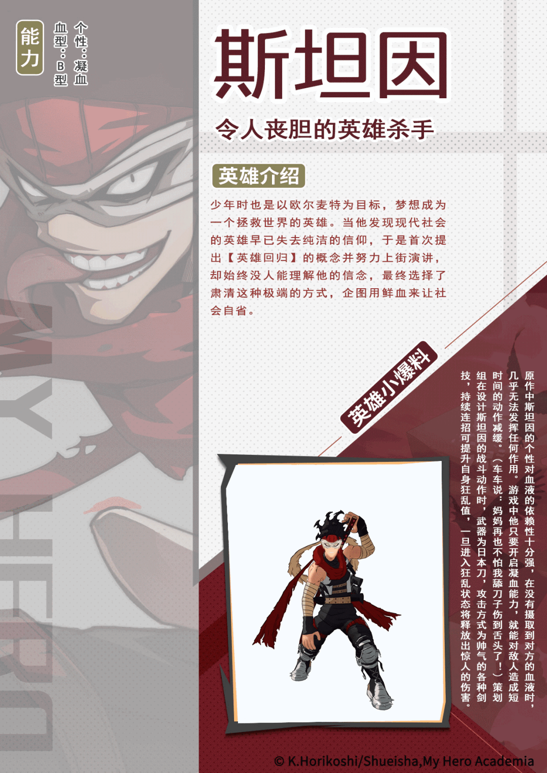 斯坦因的个性是凝血,一旦摄取对方血液便能剥夺对方的自由。凝血时间可长达8分钟,凝血时长会伴随目标血型的不同有所递减。