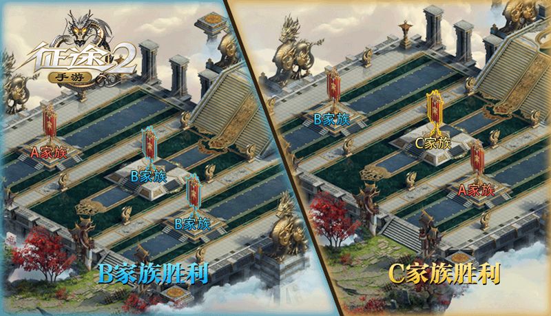 具体的玩法是,进入战斗后,会有上中下三面战旗,多个家族同时抢占,最后抢占战旗数量多的家族获得胜利。若占领战旗数量相同则占领中间主旗者获胜。