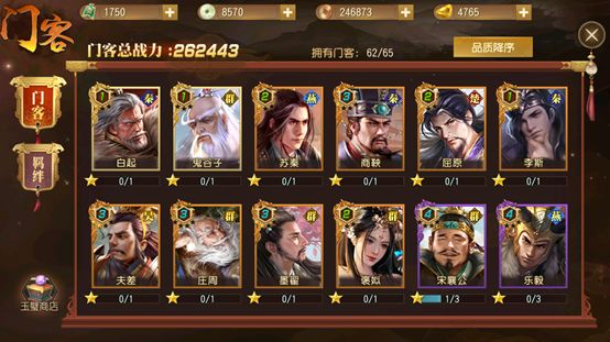 【门客系统】 门客系统共包含65位历史知名门客,将其按品质进行分级,共有绿色、蓝色、紫色、橙色、金色5个品级,品级越高的门客稀有度越高,带来的属性增益与战力越高,门客包含属性、特性、羁绊三个效果。