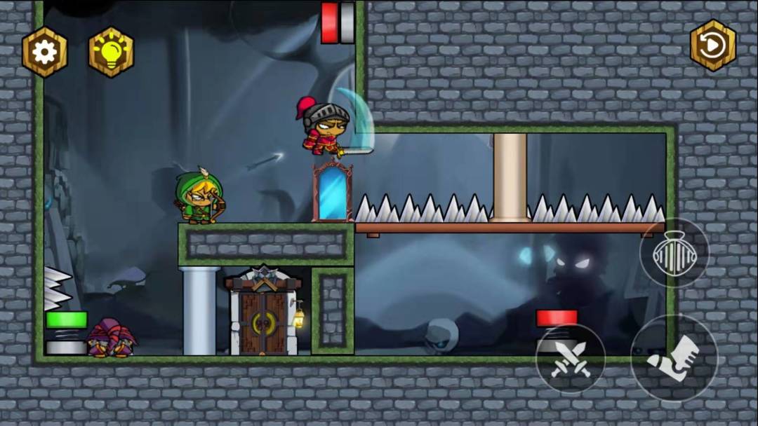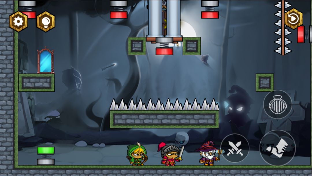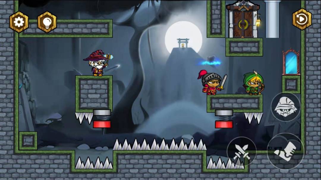 游戏的玩法很简单, 英雄小队们身怀绝技,作用各部相同。魔堡中没有其它妖怪,他们分别会把人打飞、钉在墙上和变成冰块。利用平台跳跃的方式;巧妙的躲避地刺;以及触发机关开闭柱;刚开始十几关还算容易,关卡后面一些新的组合效果需要你们来发掘,四十关之后有个道具是一个镜子,作用是反射技能。当然镜子还可以用来垫脚,相互利用技能来通关。游戏后面上手了之后就是对已有效果进行组合,并不难。游戏关卡深藏不露,多种杀伤技能和角色自带技能招数来闯关。每个小关卡都很短哟。