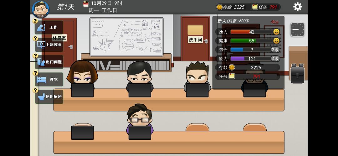 更新游戏,重新开局,选择生存,经过了新一轮面试,游戏时间为第一天,但上个档打一半的东西都在,包括技能,物品,能力,甚至任务数量,但是时间为一,信任为2,等级为新人,郭佳佳与李尽忠同时在场(因为模糊记得此时郭佳佳已经住院,也可能是记错了),时间进行到第二天,问题截图如下