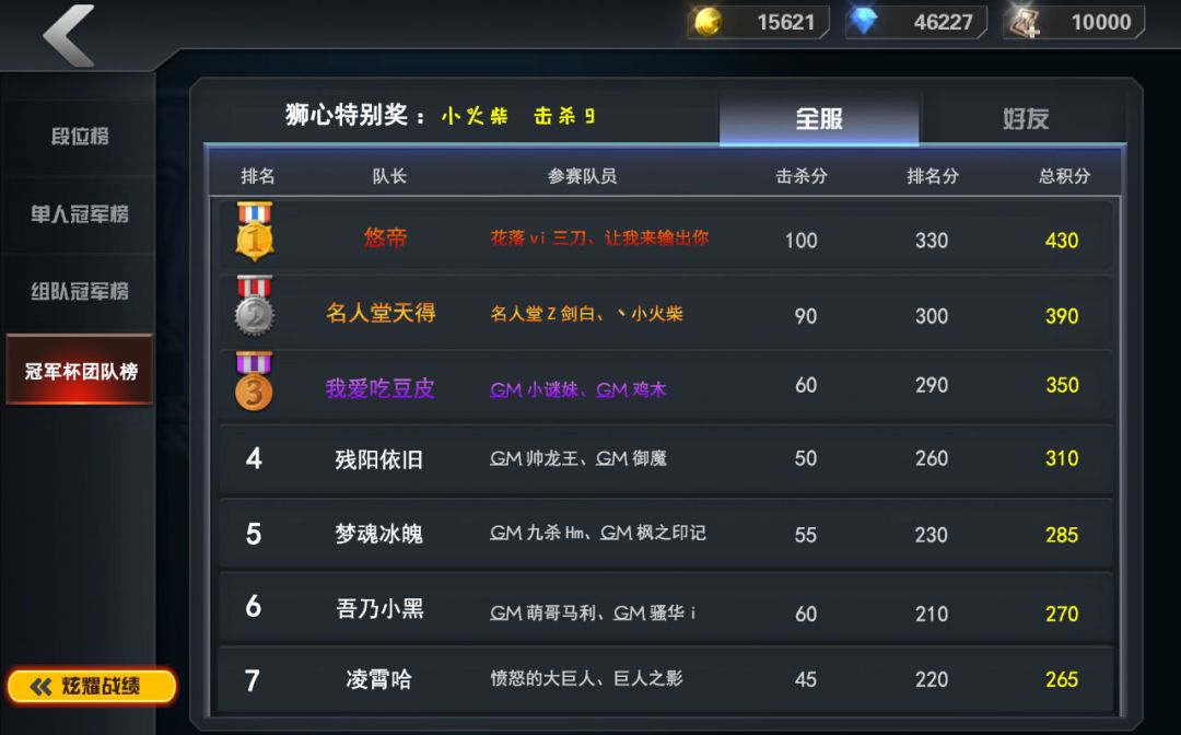 【冠军杯】团队赛 成绩公布!!!圆满收官!!!奖金已发放完毕!