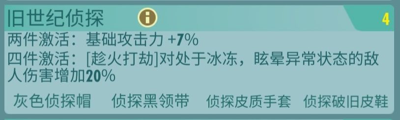 旧世纪侦探套装由灰色侦探帽、侦探黑领带、侦探皮质手套、侦探破旧皮鞋组成,两件套激活基础攻击力加7%,很适合射手类输出居民佩戴。四件套激活套装属性对处于冰冻、眩晕异常状态的敌人伤害增加20%。