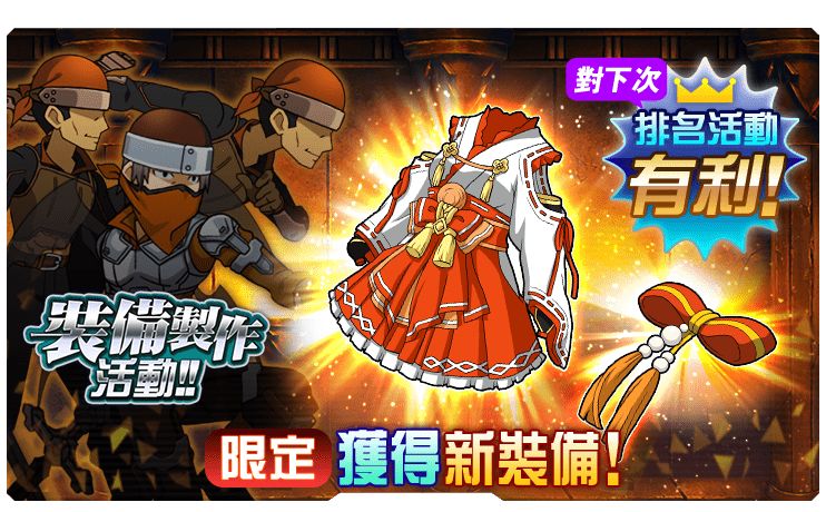 此回裝備製作活動中,等級破關絕級與絕級+1後,破關獎勵的寶箱中會出現★3限定裝備!