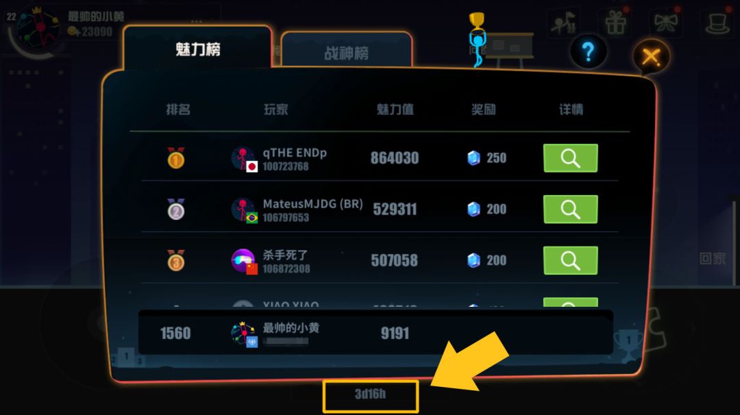 排行榜每周都会刷新一次,相应的,魅力值和击杀数也会重置。在排行榜最底部可以看到刷新的倒计时,如果想捍卫自己在排行榜上的位置,那可千万不能掉以轻心!