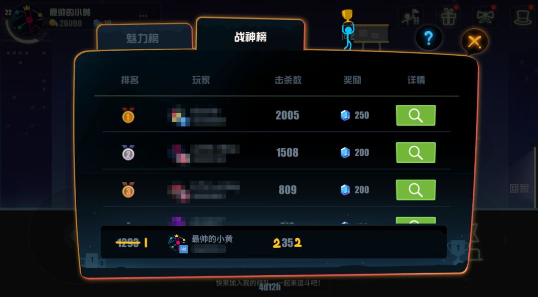小黄作为一名热血火柴人,登上“战神榜”Top10乃是毕生梦想!战神榜击杀数=玩家累计击杀数,只有战斗实力强的人才能榜上有名!给榜上的大佬们倒一杯卡布奇诺(划掉)。要想受“万柴敬仰”,战斗实力可得时刻在线!听说有人质疑本黄的实力?呵,战神榜数据说话!↓