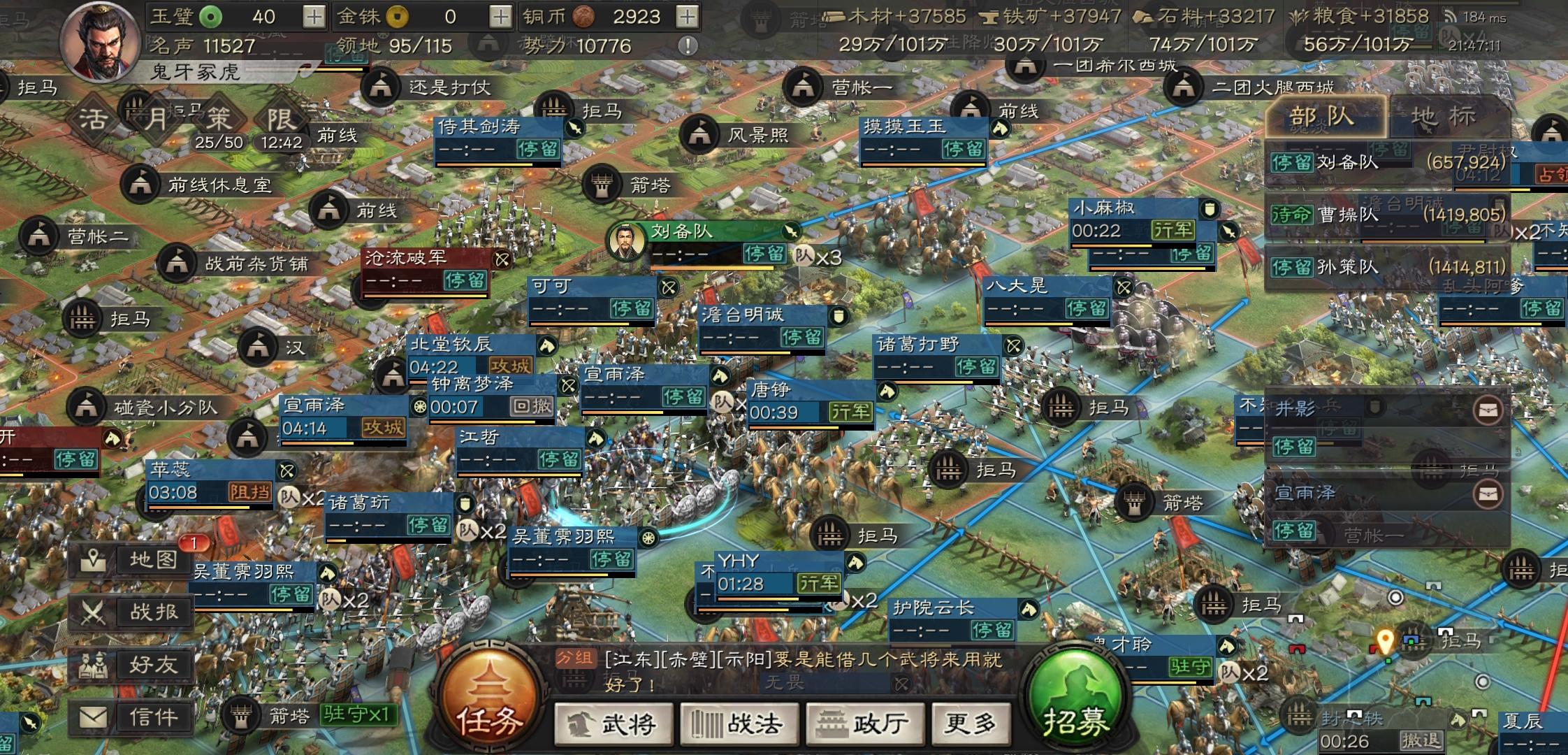 从我们区开区到现在,一直很和谐,大家都是种种田,打打城。昨天正式开始了大规模战争,几乎半个版图都是战火,不过我特别沉迷这种东奔西跑拉锯战的乐趣,虽然两天战死二十万士兵,但是我感到痛并快乐着。虽然不知道结果是谁入主洛阳城,不过这种过程才是我想要的
