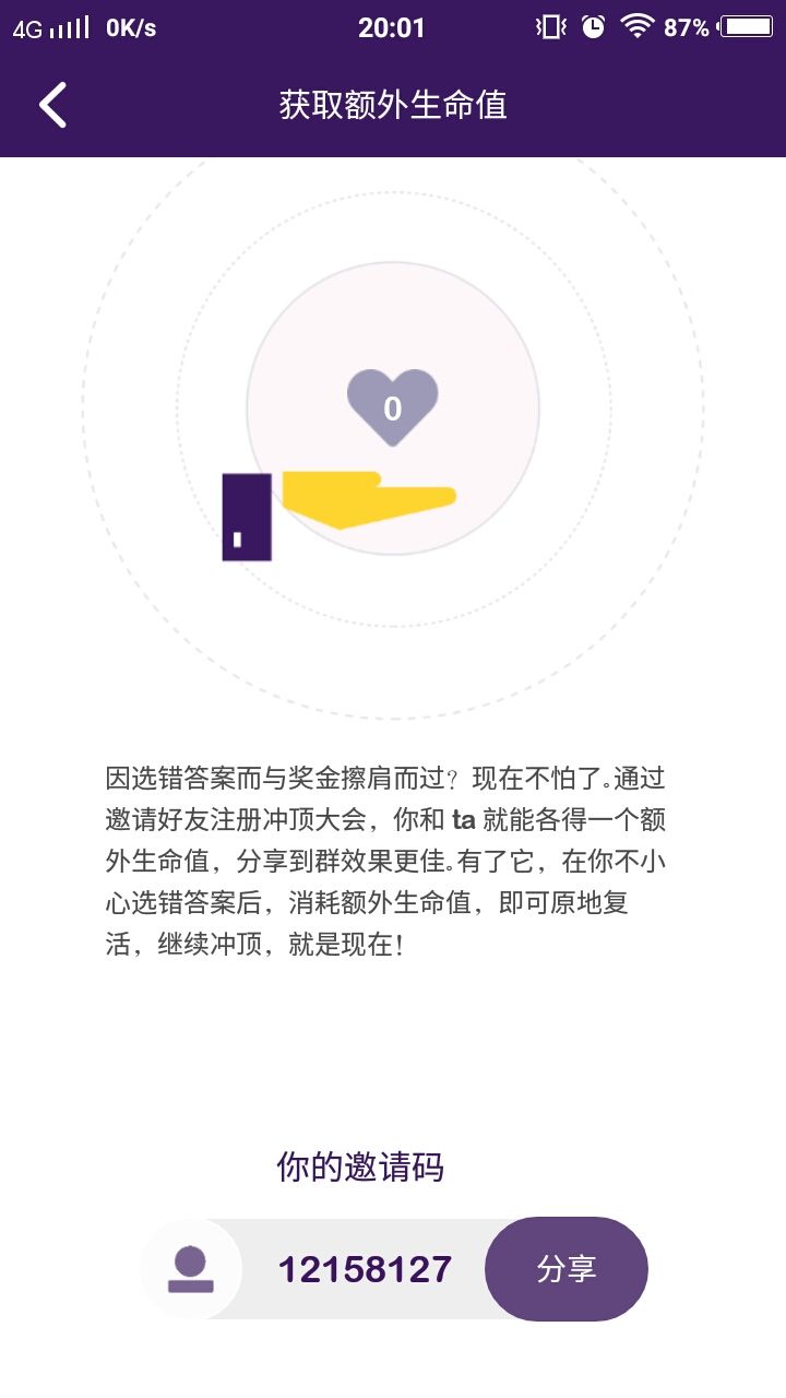 如图,我的邀请码明明是12158127,结果分享出去少一位数!!!!怪不得我邀请了三个朋友了我一颗心也没有!!!!大家引以为戒!!!