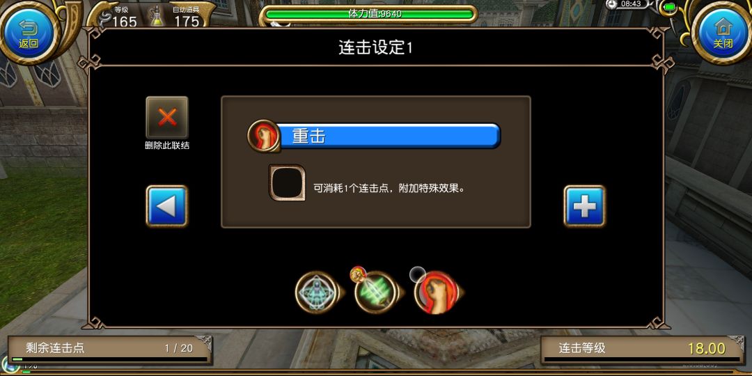 连击点熟练度根据设置的技能数量以及耗蓝度增长经验值升级后得到1连击点,最多20连击点