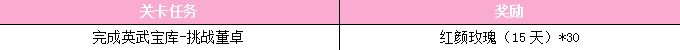 可能有的小伙伴还不太了解英武宝库,这里梦梦稍作解释一下,这里的关卡任务并不是完成【挑战董卓】就能获得红颜玫瑰哦,而是完成以后通过获得的英武宝石去英武宝库轮盘抽奖,轮盘是不会重置的,所以只要多打打副本,这30个红颜玫瑰是一定都能拿到手的。